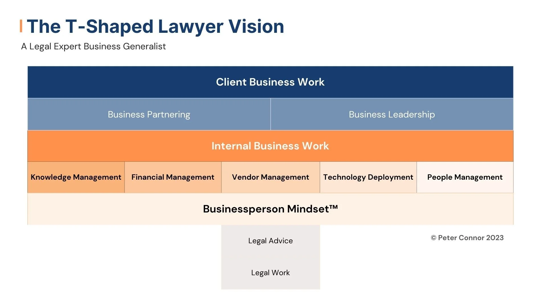 I was the first in the world, in 2014, to apply the well-known and widely adopted t-shaped professional concept to in-house lawyers in my workshops and later in my article, The T-Shaped Lawyer, published in Association of Corporate Counsel’s Docket magazine and elsewhere. The graphic from that article, depicting a range of non-legal skills, is still understood and quoted, by many to represent the idea a T-Shaped Lawyer.