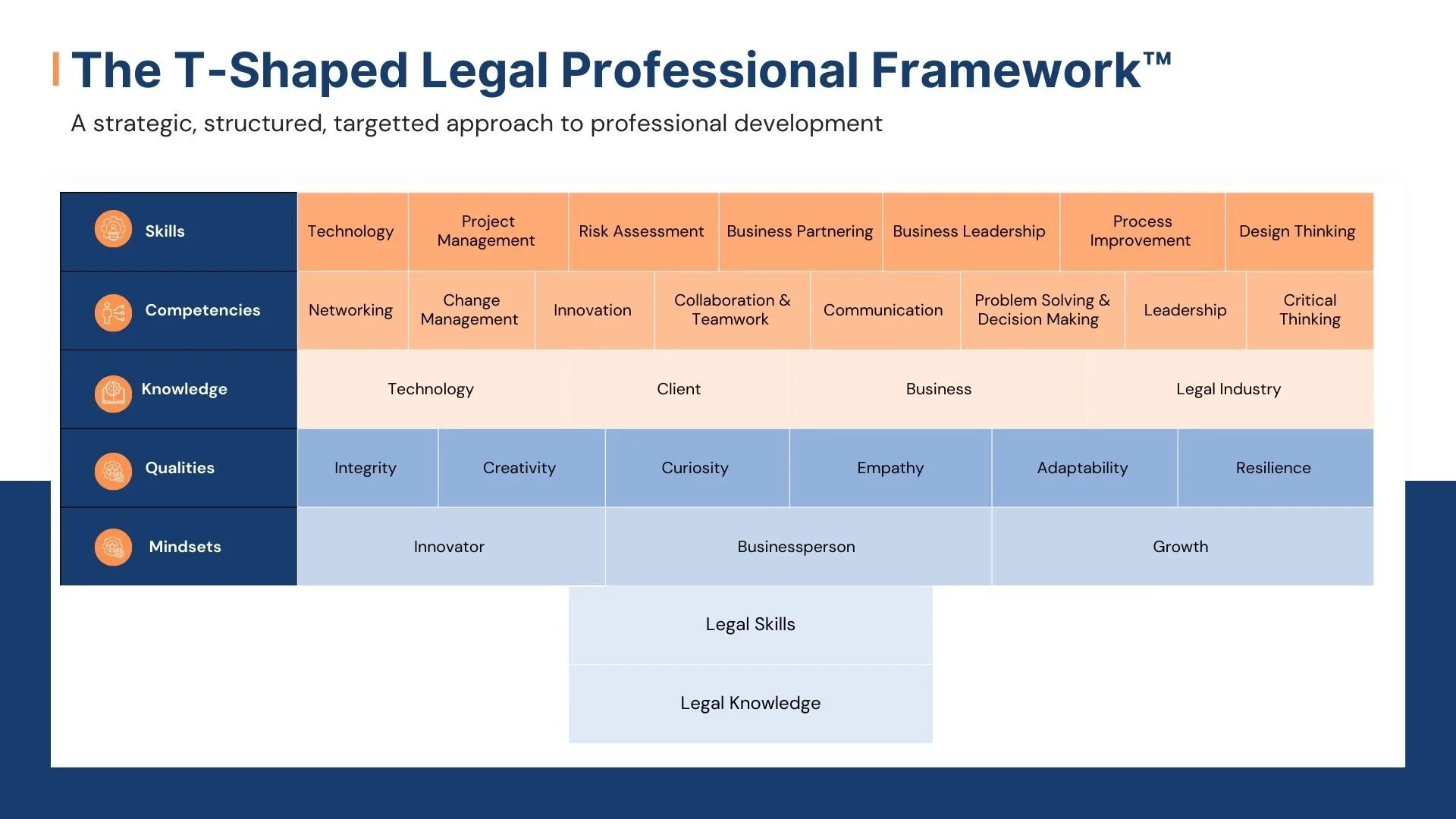 However, that initial idea is now outdated - the focus now is on what you do in your work, not just on what you are capable of doing. Since then I have worked exclusively on refining, developing and testing my ideas with thousands of lawyers all over the world in my work. The result is a Vision for a T-Shaped Lawyer, as shown above, and a T-Shaped Legal Professional Framework™ of specific non-legal skills, competencies, qualities, mindsets and knowledge, as shown below, that can and should be developed and used in traditional legal work and in business work.